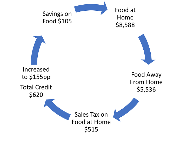 Calculating the Total Value of the Increased Credit: Using Idaho’s current population of 2.002 million, if we assume the $155 credit will be claimed for everyone, the value of the credit would be $310.3 Million. If every family were able to itemize to $250 per person in grocery taxes, the credit would total $500.5 Million. While it is true that some people, such as those on food stamps, are not eligible for the grocery credit, and that some able to itemize will choose not to, the estimated $407.1 Million in revenue is still solidly within the estimated range for the credit.
